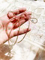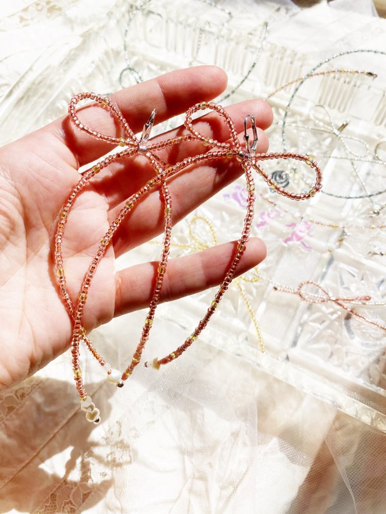 Each pair of hand beaded bow earrings is on a sterling silver plated earring clasp and features rose quarts and freshwater pearl beads.