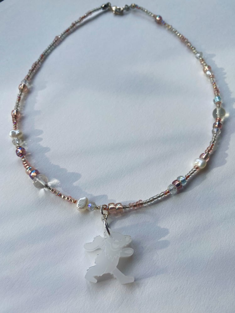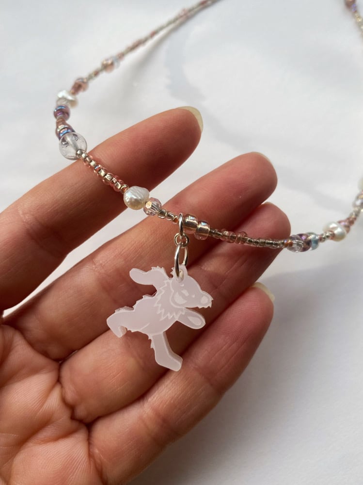 One of a kind beaded necklace featuring freshwater pearls, glass beads, and a white dancing bear charm.