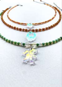 Hand beaded necklaces featuring laser cut iridescent charms. Each necklace is adjustable. Please see below for necklace length range. If you dream of a necklace with a different charm or different color palette please send me an email. I am more than happy to make a custom piece.