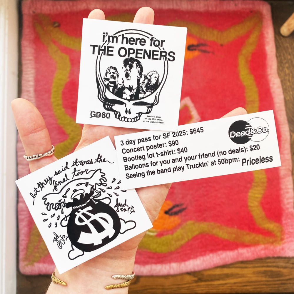 It's not GD60, it's just Bobby and Mickey playing in SF for the 60th anniversary of the beginning of the Grateful Dead and these are my stickers celebrating these shows. Please note that the Priceless sticker is by Christopher Danella, but he doesn't have a webshop so I'm selling them here!